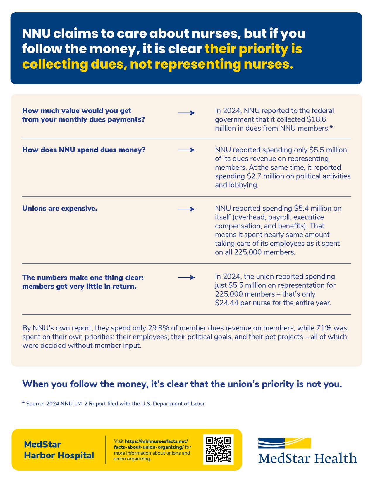 If National Nurses United (NNU) unionize nurse associates at MedStar Harbor Hospital you will be required to pay monthly dues to NNU. Dues are deducted from your after-tax take home pay.