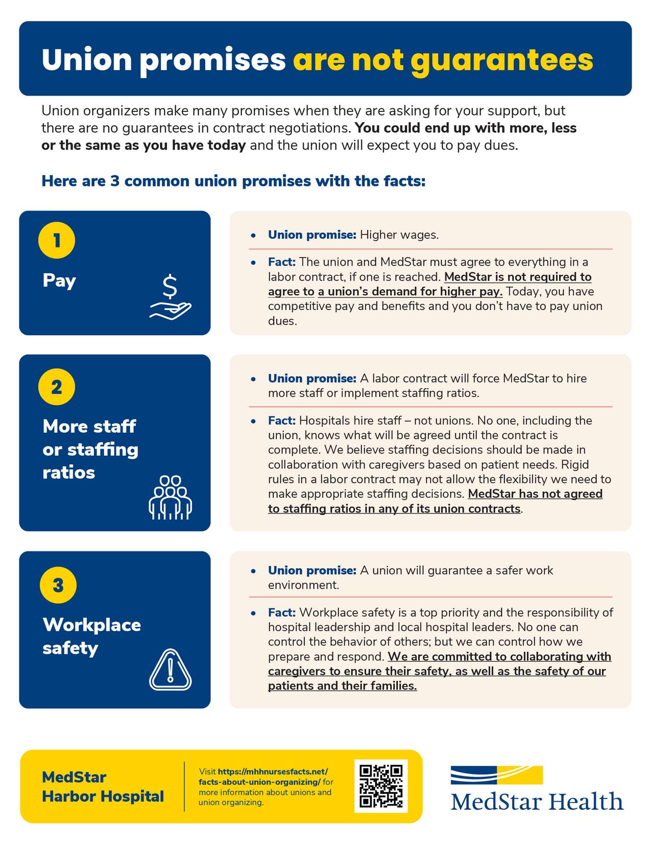 Fact: The union would not have a say in MedStar Harbor Hospital’s policies and day-to-day operations. Those matters are typically part of management rights, along with hiring and firing decisions, discipline, staffing and resourcing, and enforcing all policies, procedures, and work rules.