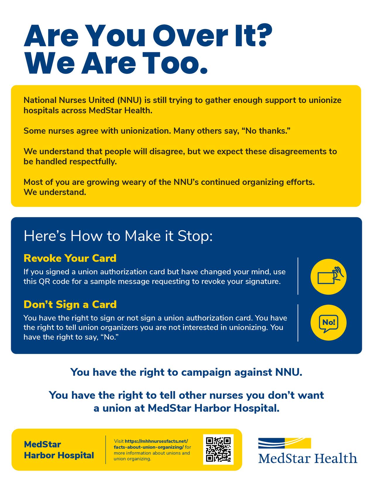 We have heard from many nurses who say they are done with NNU’s ongoing organizing activity.